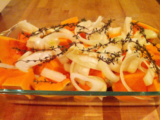 At this point you could peel the skin off, but I prefer to give it 20 minutes in the oven, then it comes off a bit easier. Place the squash, the chopped onion, the thyme, and 1 cup of veg stock in a large roasting pan, drizzle some oil on top, let it roast for an hour to an hour and a half, turning the squash every 15 minutes until all sides are caramelized.
